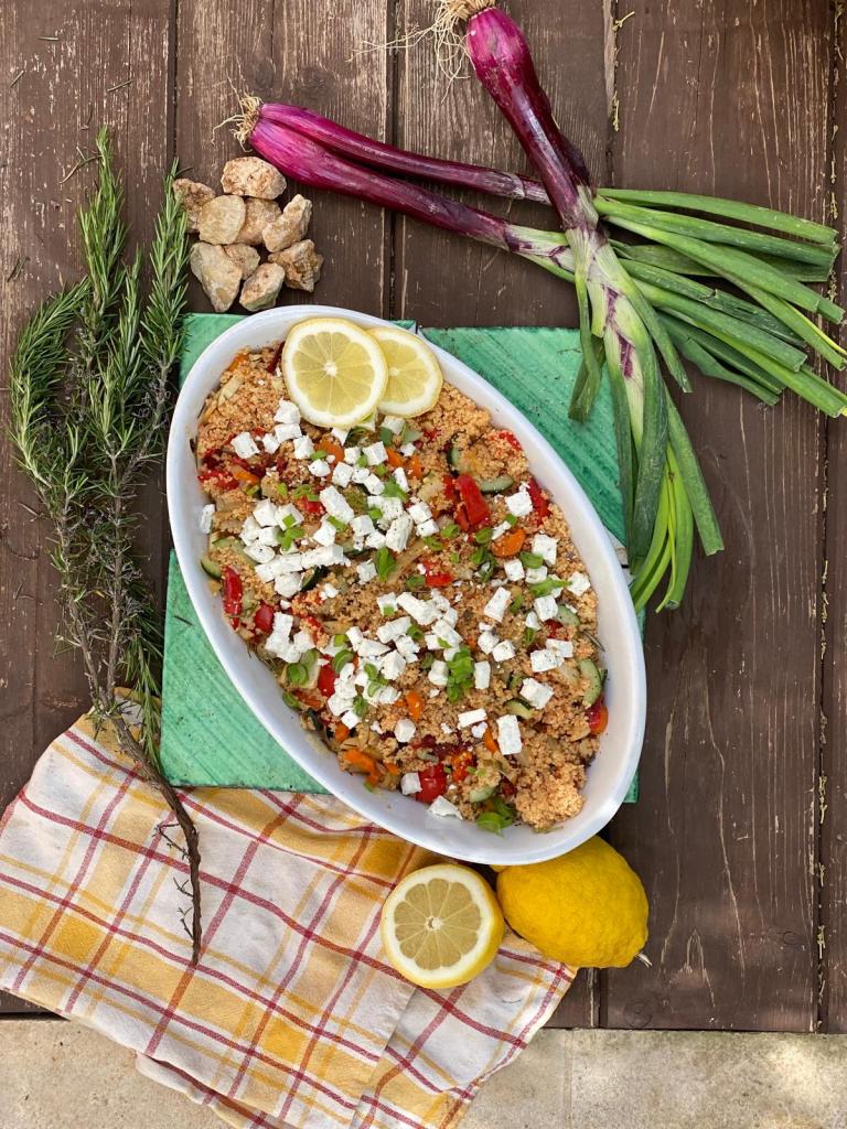 Couscoussalade met gegrilde groenten, komkommer en walnoten